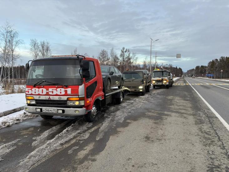 Эвакуатор Mitsubishi Fuso в г. Улан-Удэ с ломаной платформой, лебедкой и подкатными.